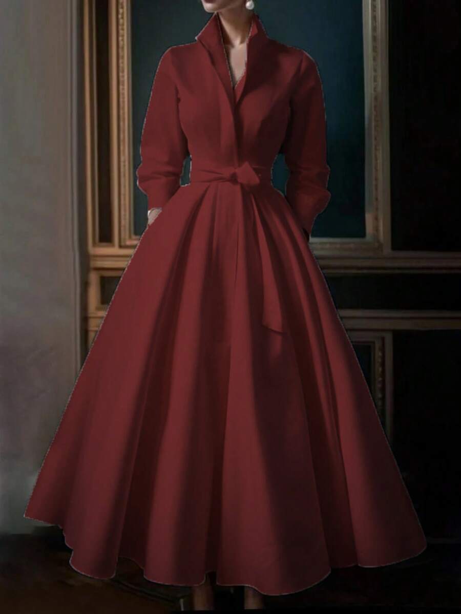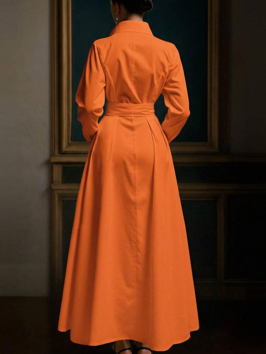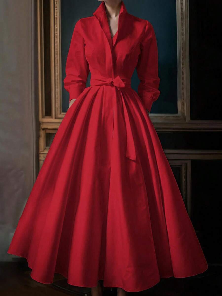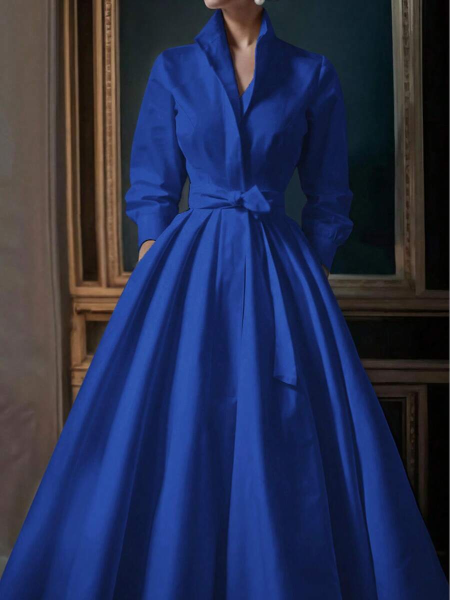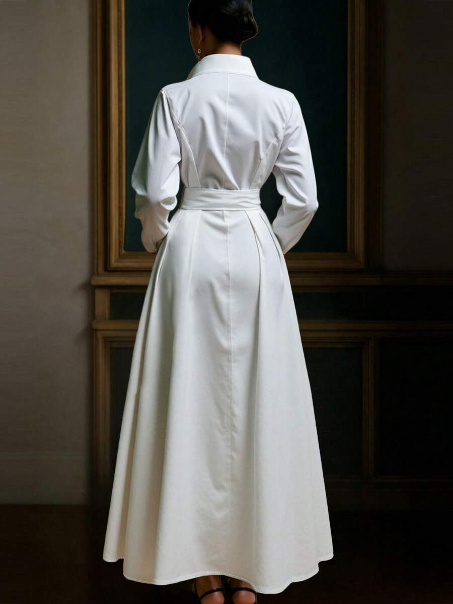 Unadoll Women’s Elegant White Shirt Collar Waistband Dress