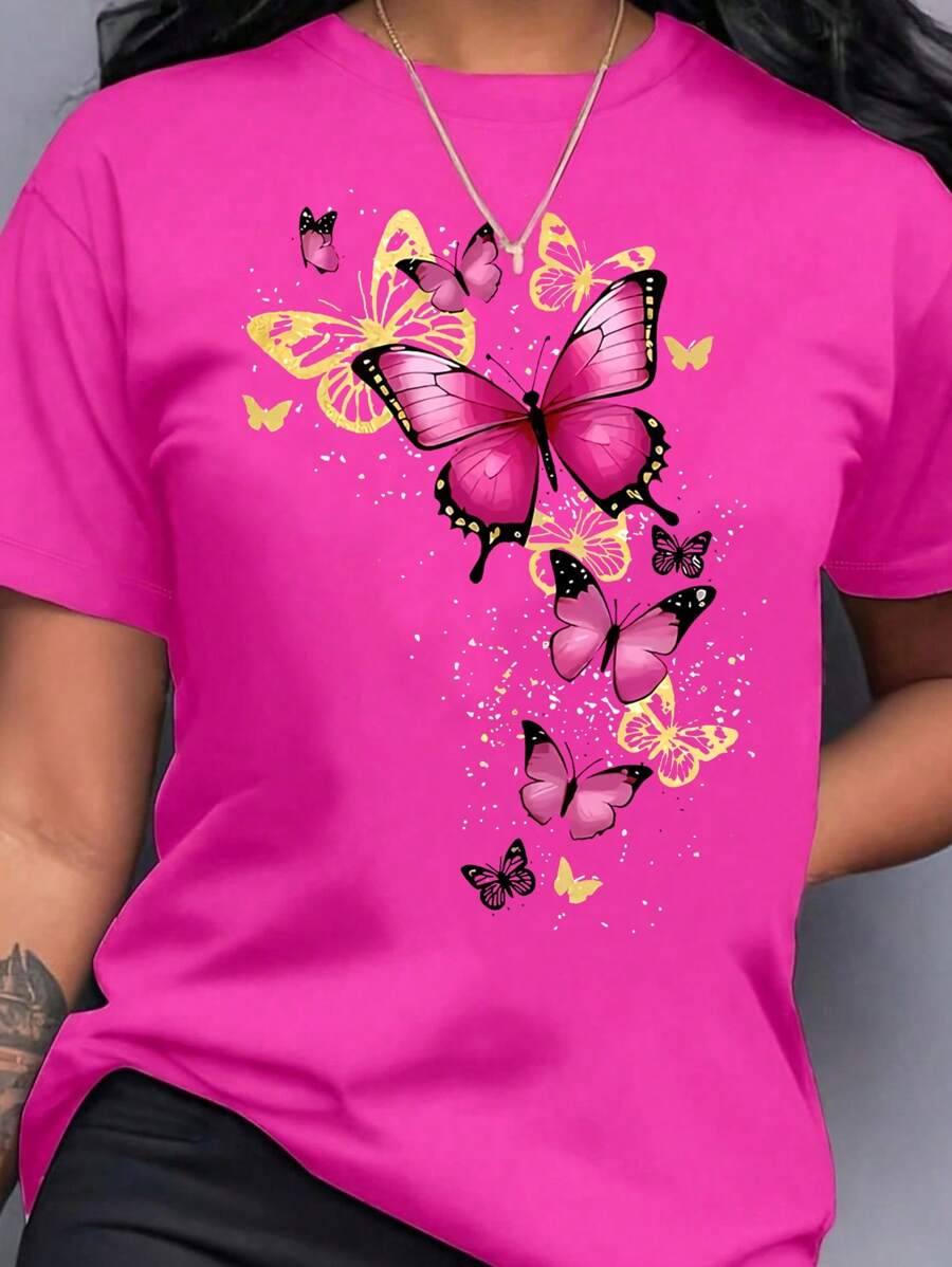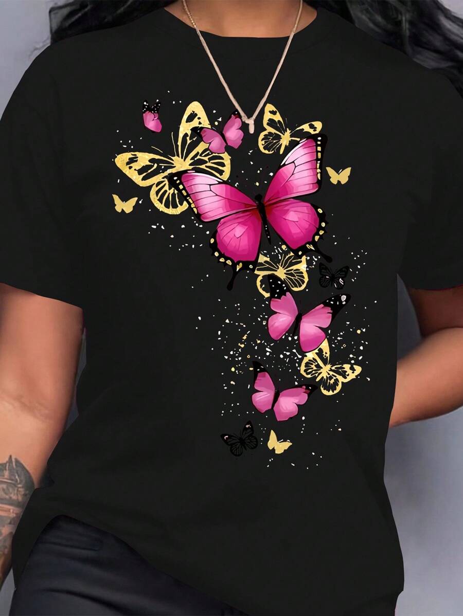 Women’s Std Size Summer Butterfly Print Crew Neck Tee