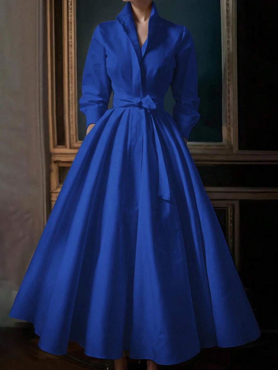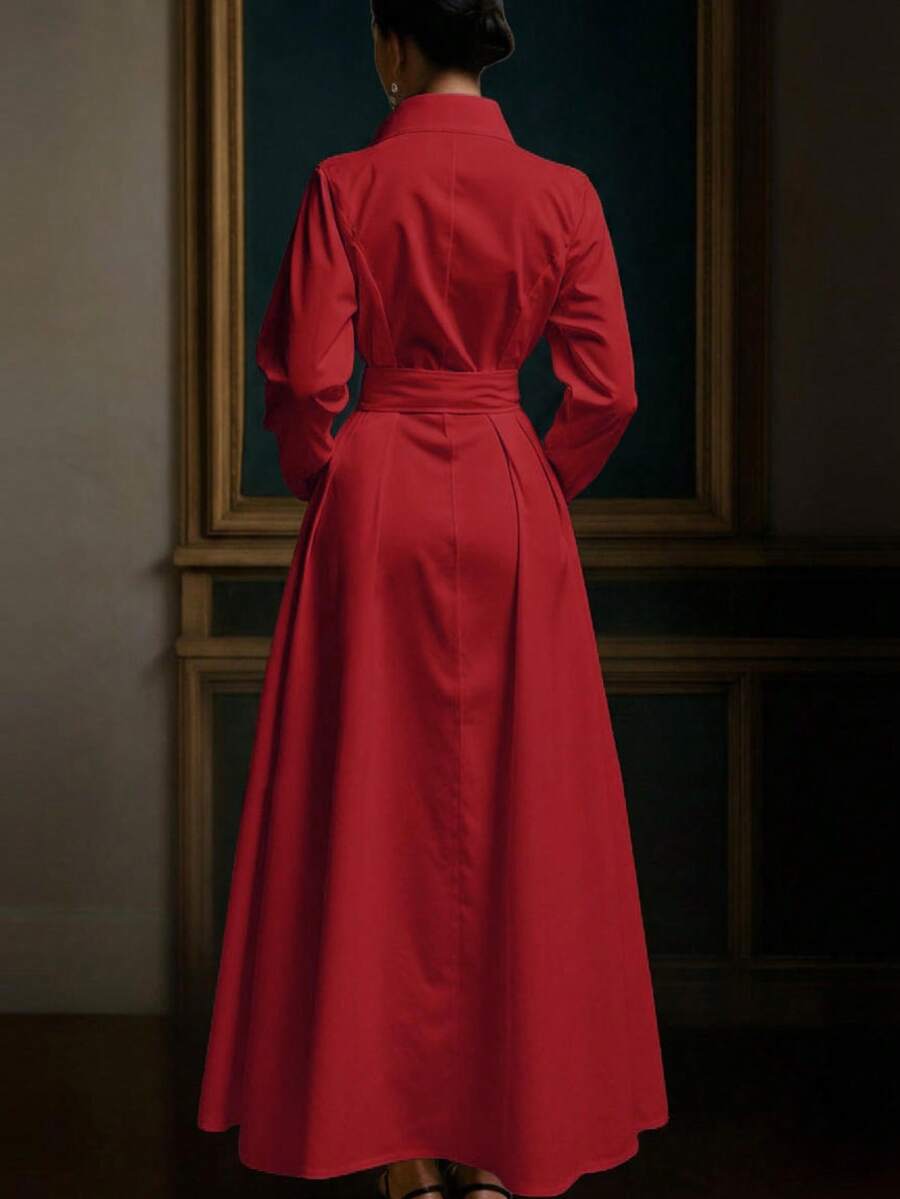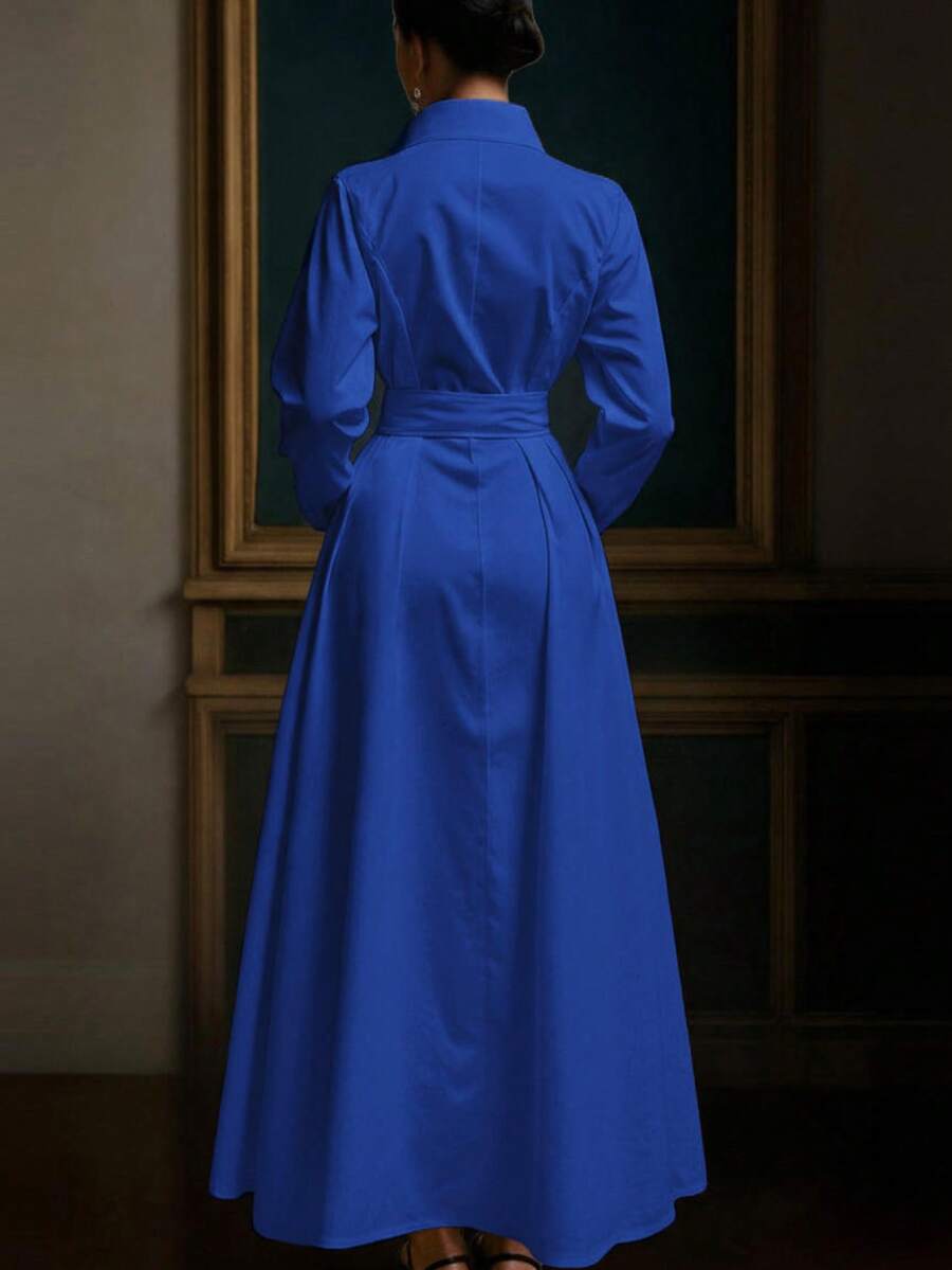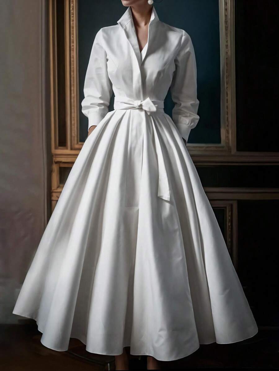 Unadoll Women’s Elegant White Shirt Collar Waistband Dress