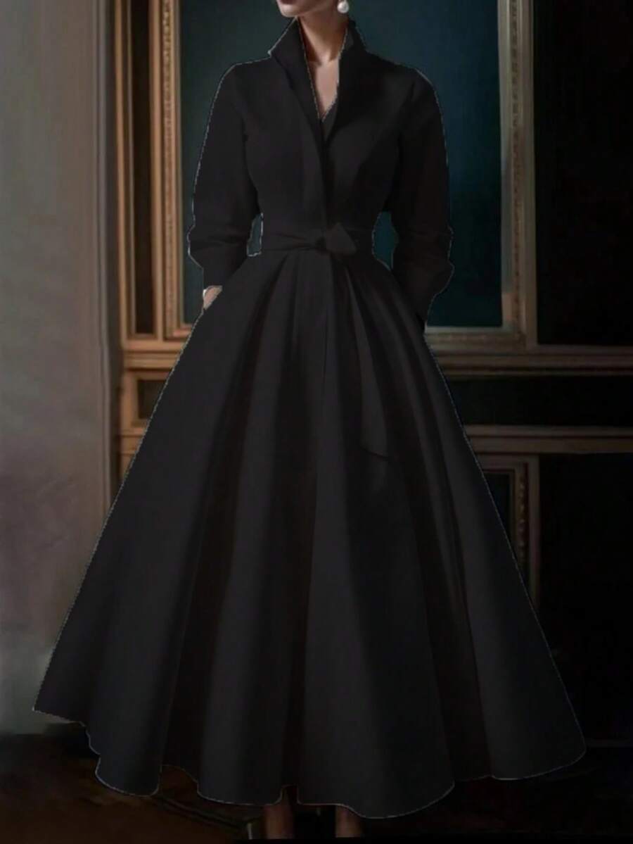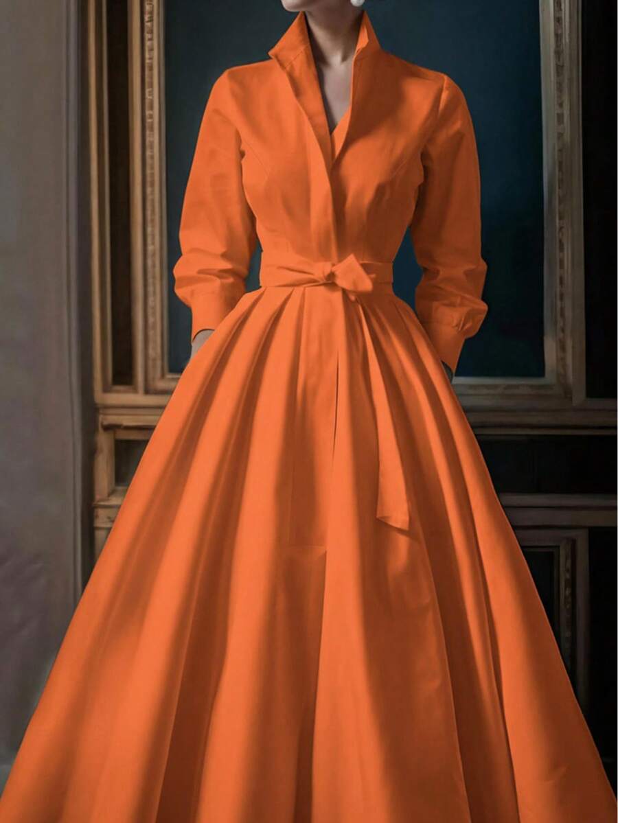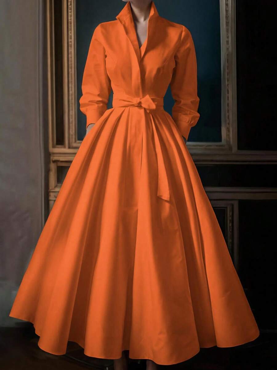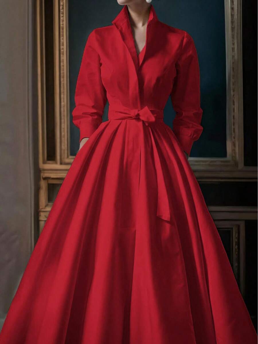 Unadoll Women’s Elegant White Shirt Collar Waistband Dress