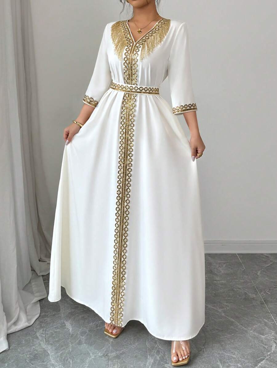 Women’s Vintage V-Neck Sequin Tassel Patchwork Midi Dress