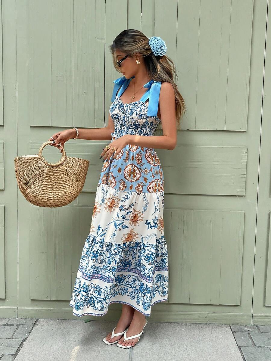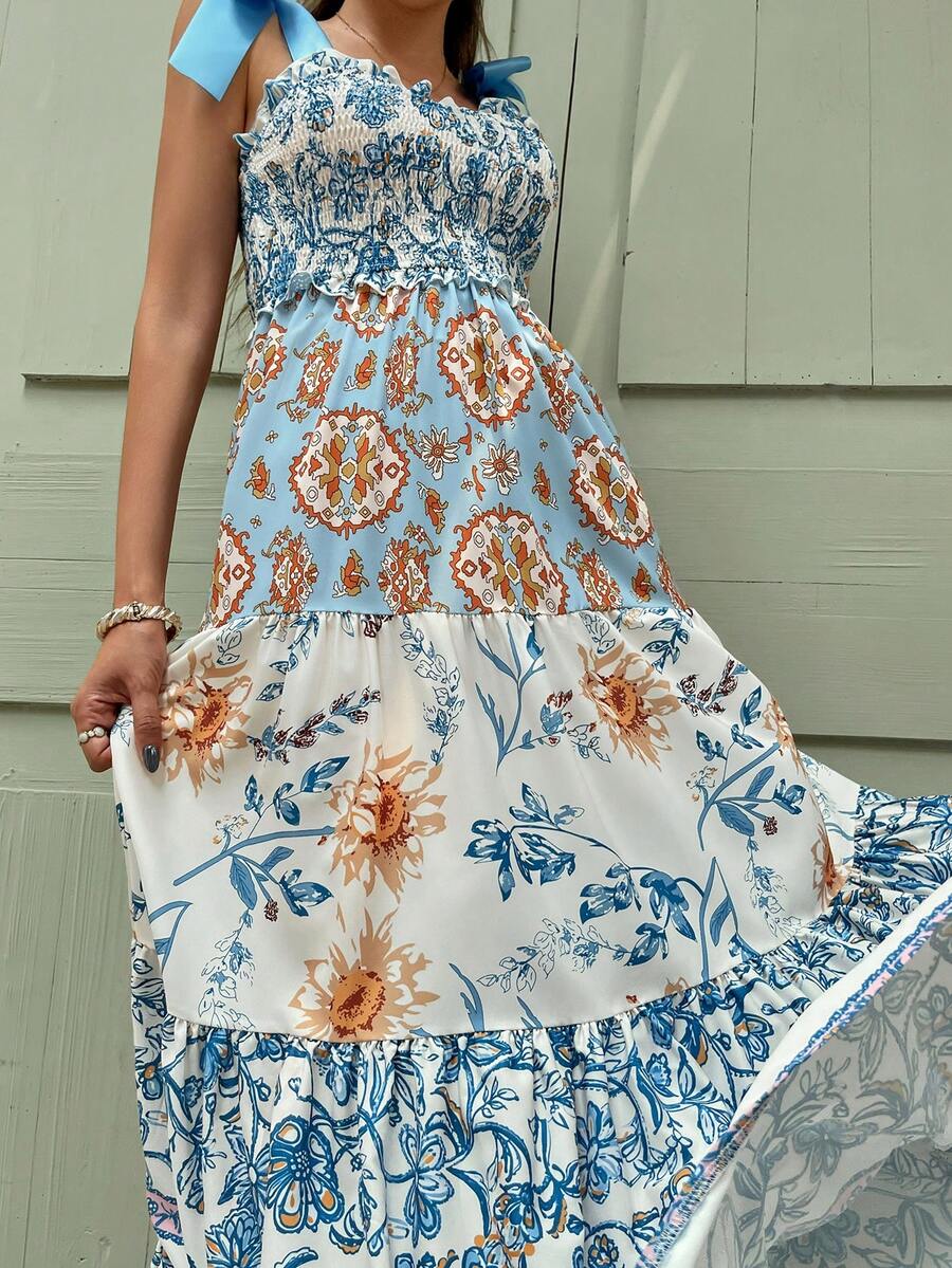 SHEIN Holidaya Surplice Neck Shirred Waist Tiered Maxi Beach Dress